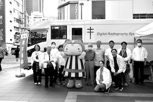 正しい知識をより多くの人に深めていただくためのリーフレット、複十字シール運動の資料、シール坊やボールペン、付箋の入った啓発グッズは700セット用意されましたが、足早に急ぐ通行人に声を枯らしながら、予防会と私たちのパワーで全て渡し済みになりました。 レントゲン検診を担当された専門医の説明では、74人が受診し内1人は要精密検査、1人が要経過観察ということがわかり指導されたそうです。 天候に恵まれた土曜日、シール坊やも奮闘し、地婦連から参加の岡野さんとともに、変貌する秋葉原で心地よい汗をかきました。 | ||